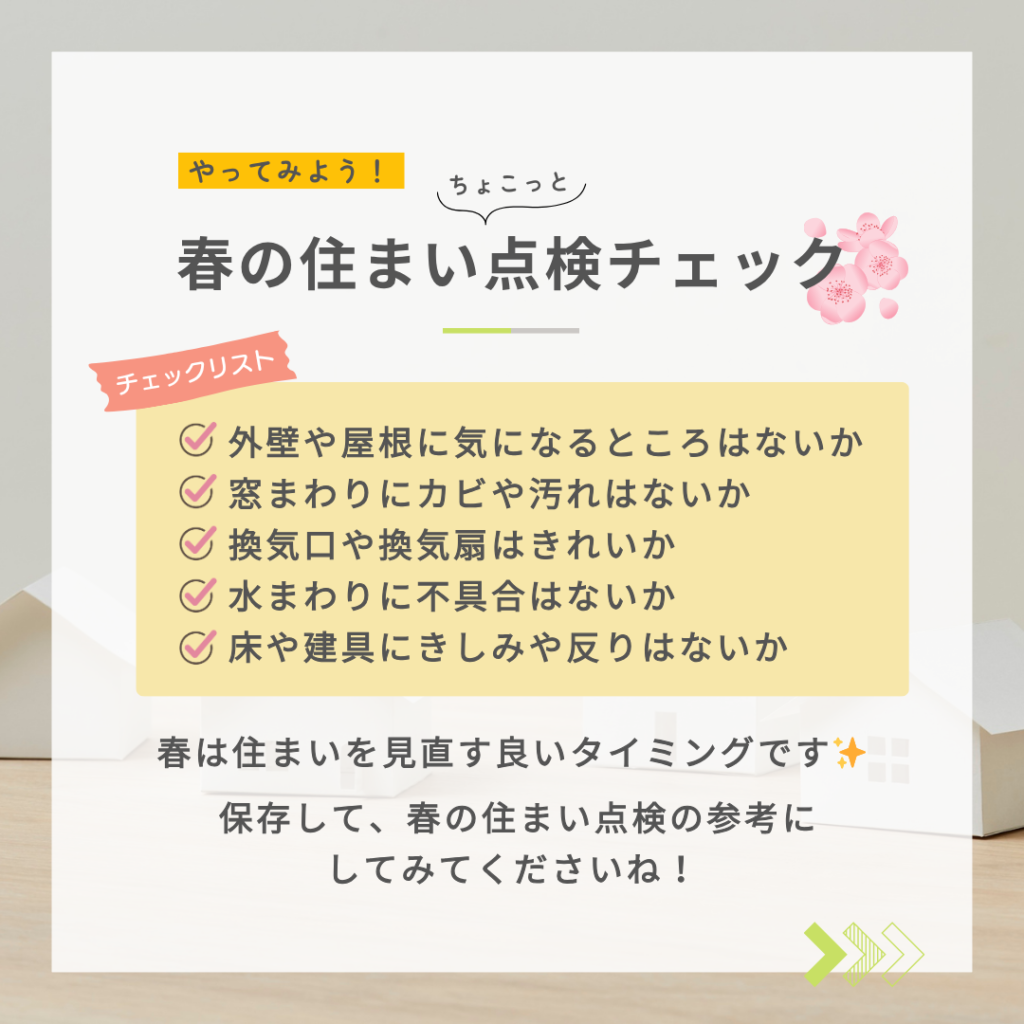春は住まいを見直す良いタイミングです。小さな不具合も、早めに整えておくことで安心につながることもあります。ぜひ参考にしてみてくださいね♪