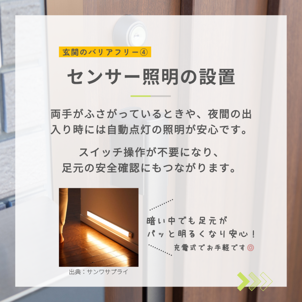 両手がふさがっているときや、夜間の出入り時には、自動点灯の照明があると安心です。