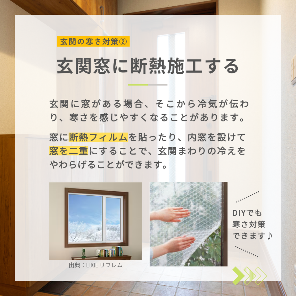 窓に断熱フィルムを貼ったり、内窓を設けて窓を二重にすることで、玄関まわりの冷えを和らげることができます。
