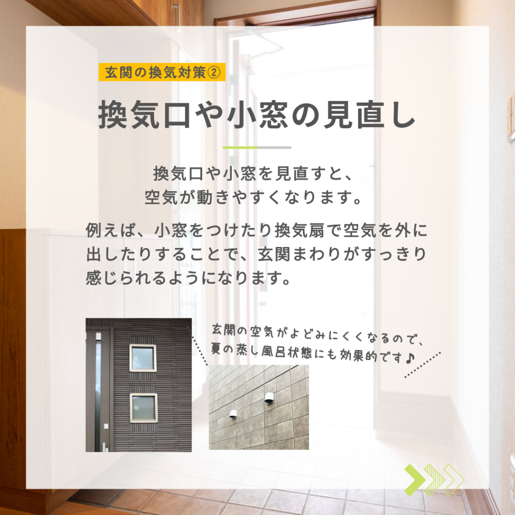 例えば、小窓をつけたり換気扇で空気を外に出したりすることで、玄関まわりがすっきりと感じられるようになります。