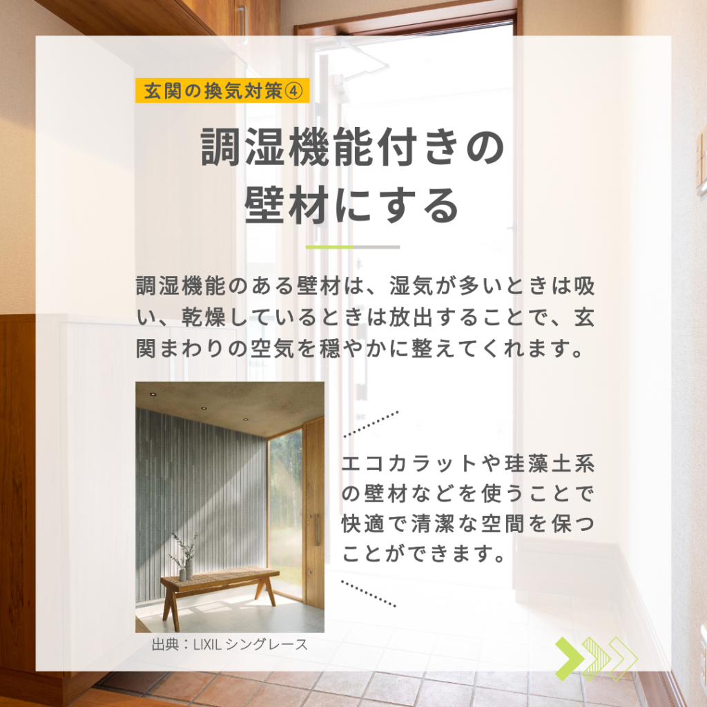 調湿機能のある壁材は、湿気が多いときに吸い、乾燥しているは放出することで、玄関まわりの空気を穏やかに整えてくれます。