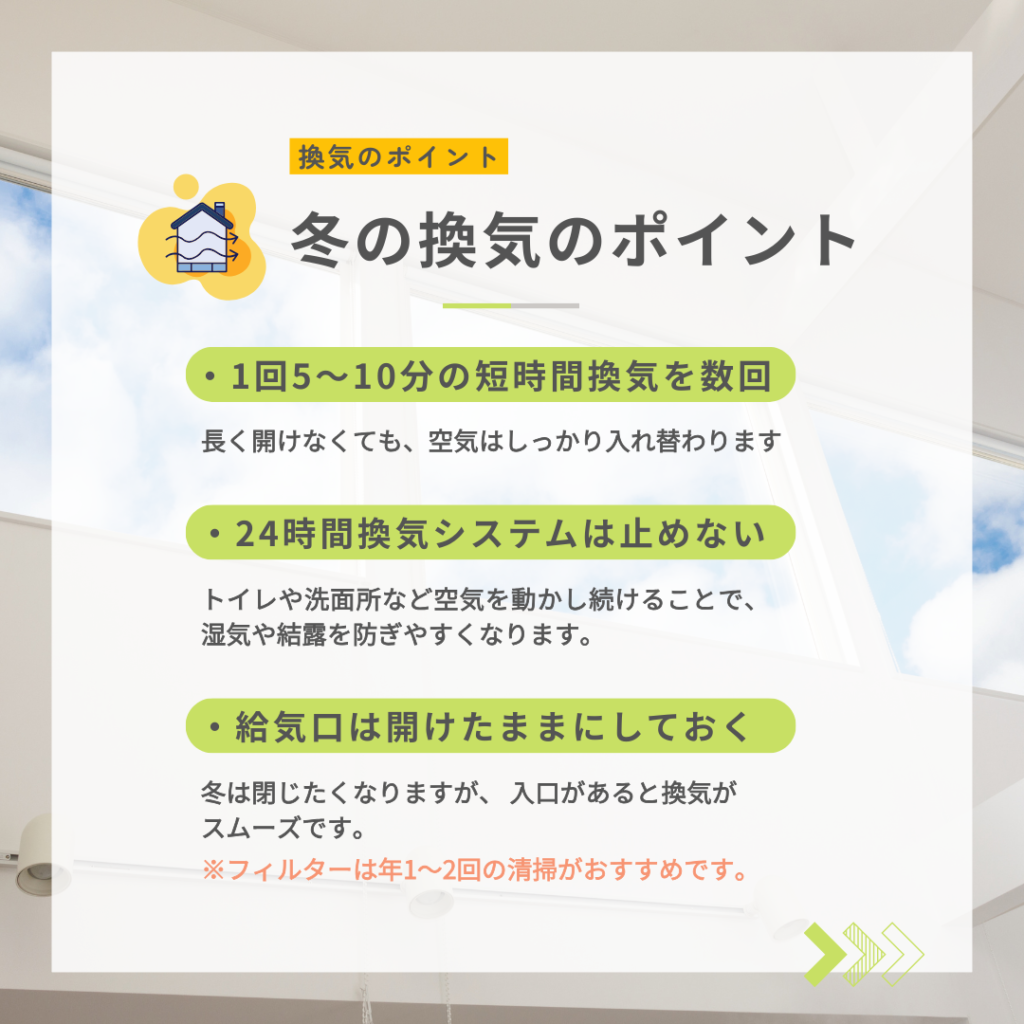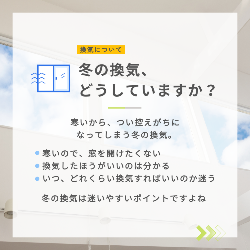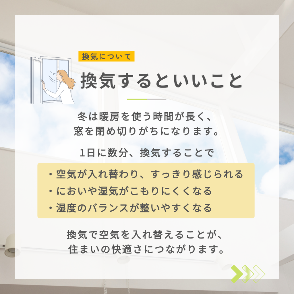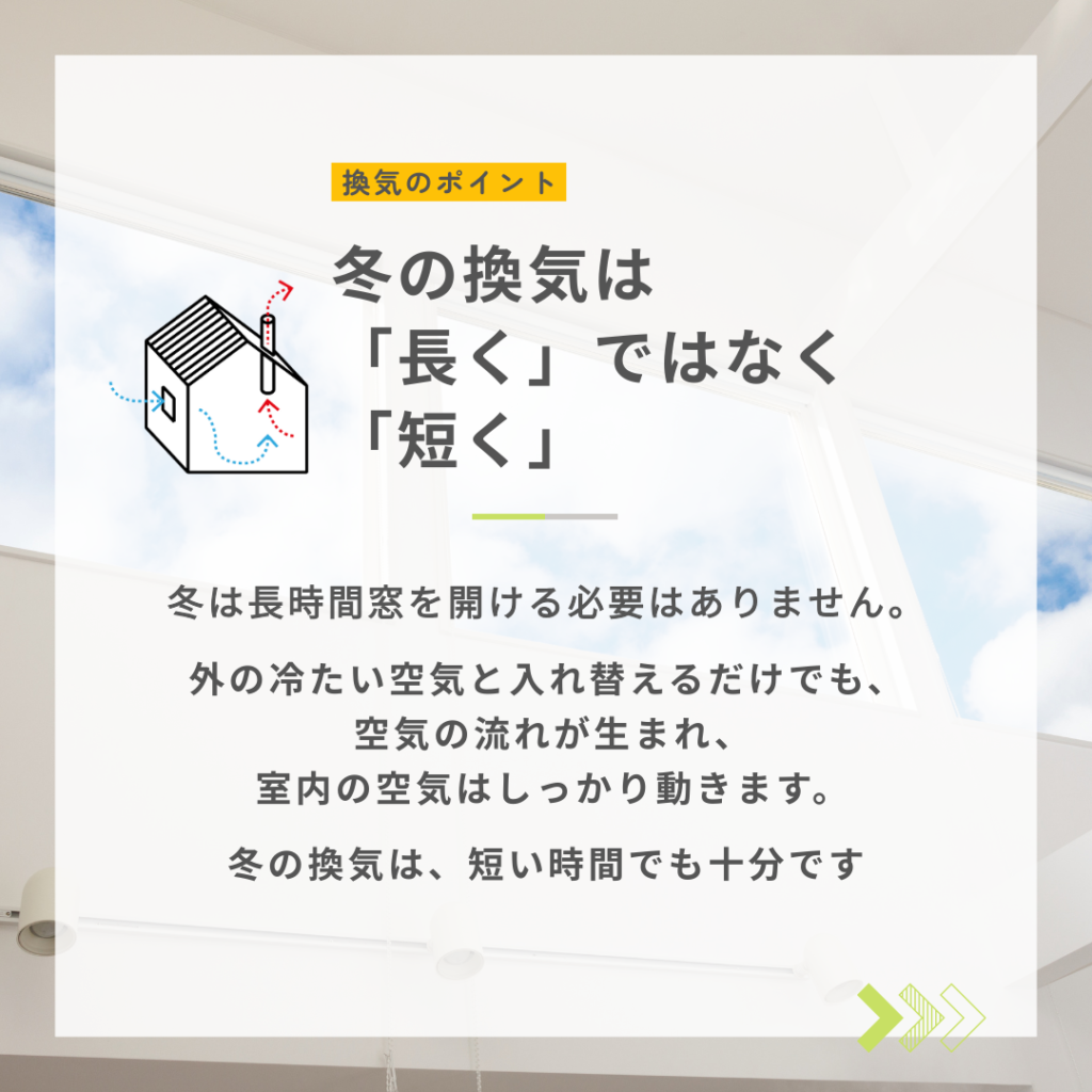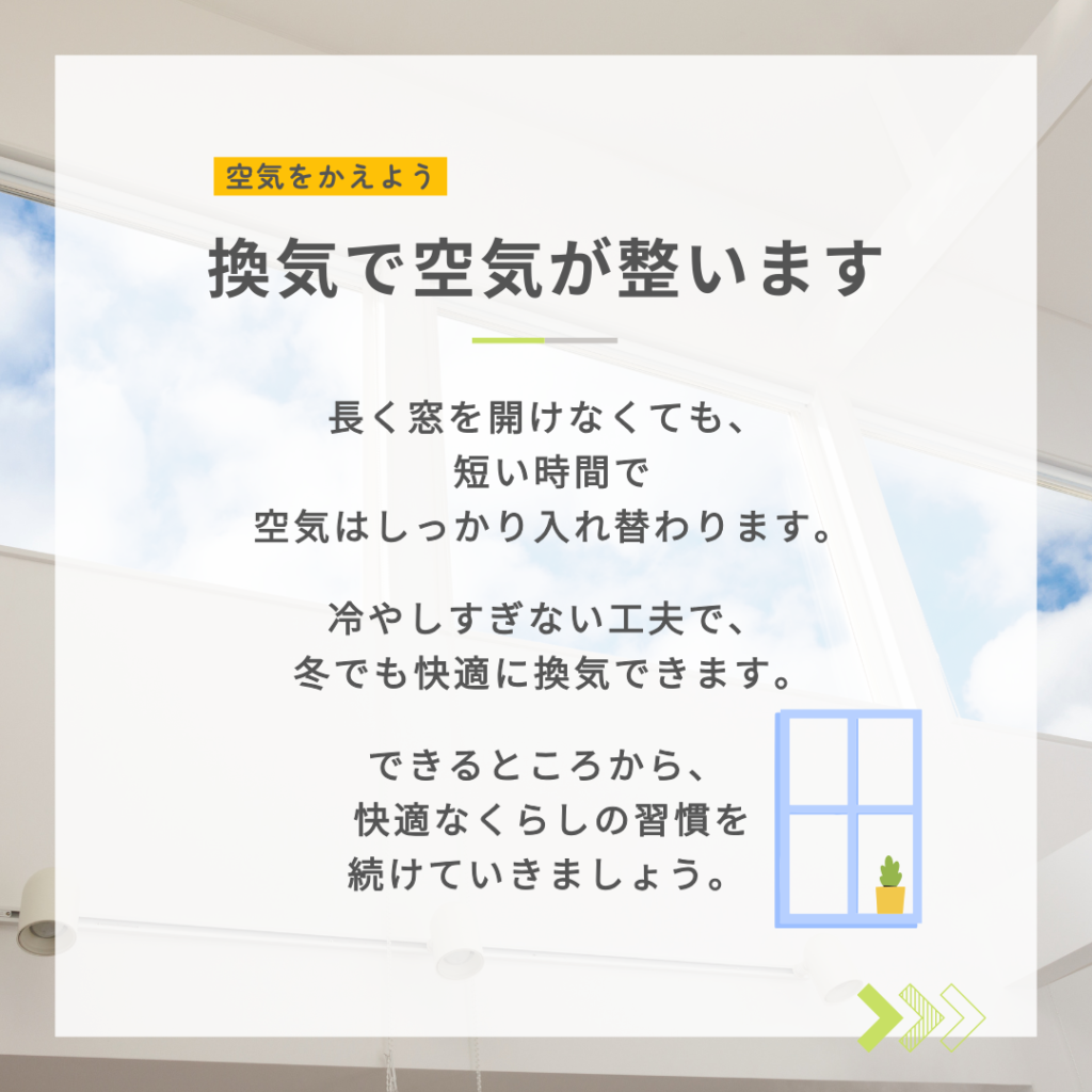 長く窓を開けなくても、短い時間で空気はしっかり入れ替わります。冷やしすぎない工夫で、冬でも快適に換気できます。できるところから、快適な暮らしの習慣を続けていきましょう!