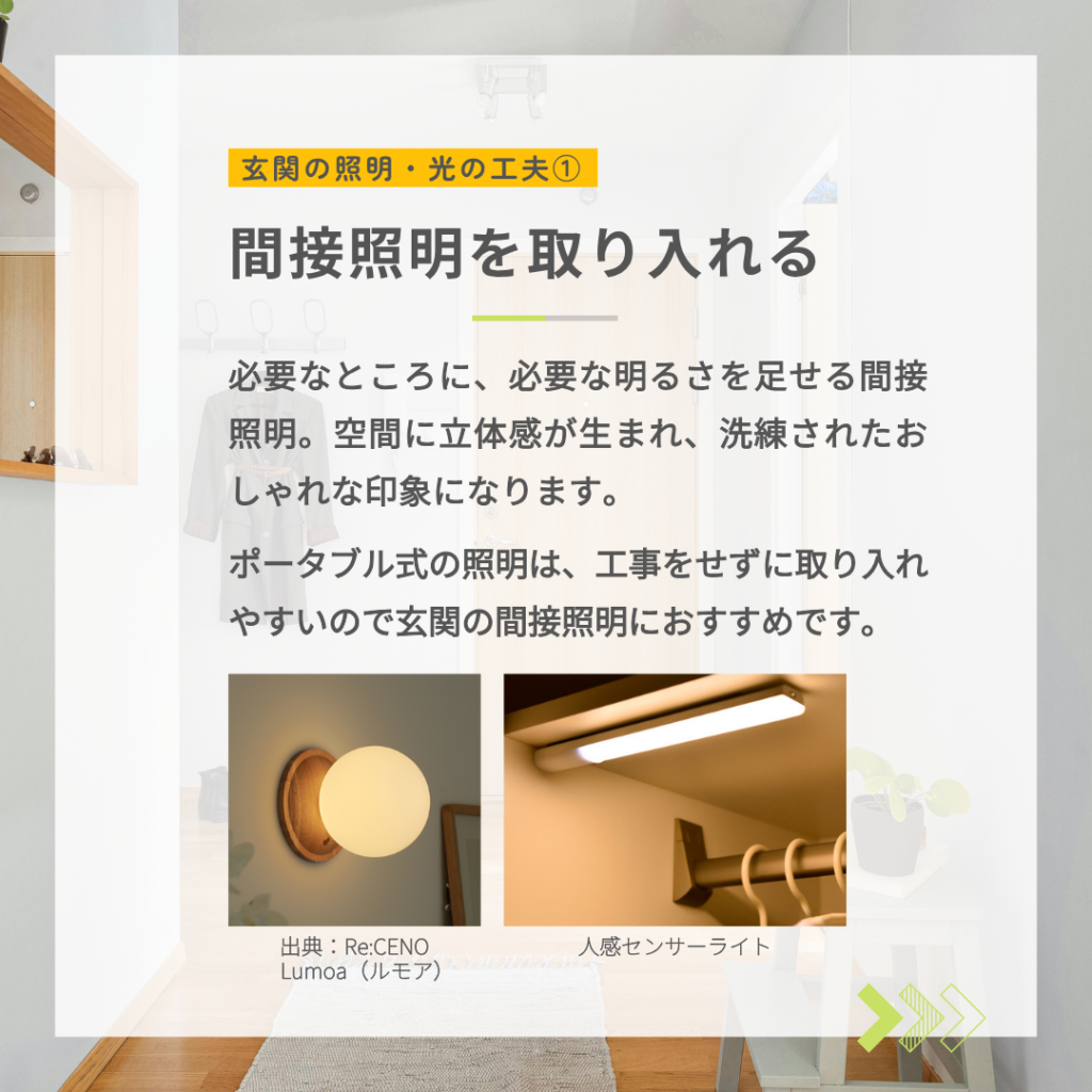 ポータブル式の照明なら、工事をせずに取り入れやすいので、玄関の間接照明におすすめです♪