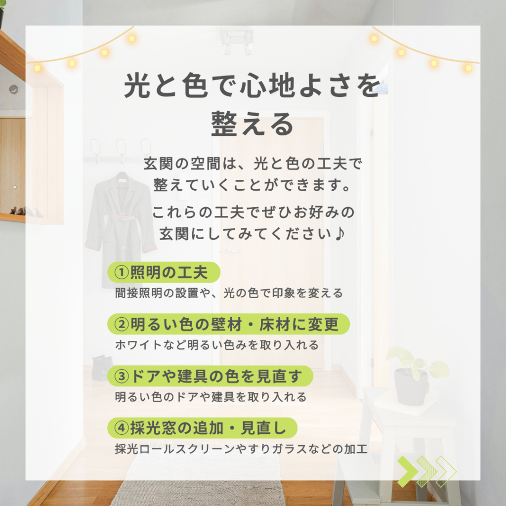玄関の空間は、光と色の工夫で整えていくことができます。これらの工夫で、ぜひお好みの玄関にしてみてください♪